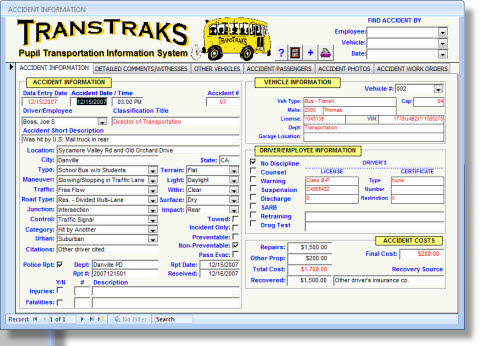 Capturing Accident/Incident information is standard in TransTraks, including linking accident photos, vehicle work orders, etc.