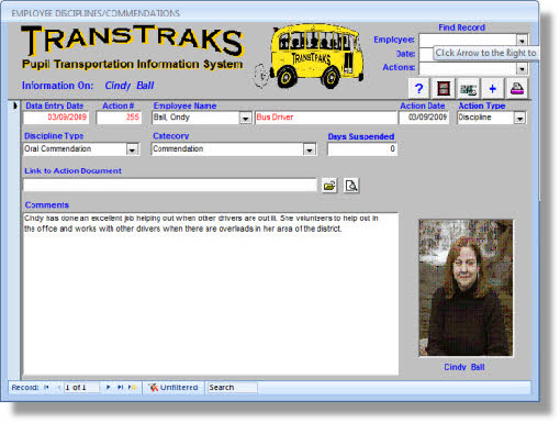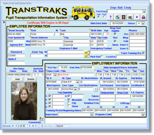 TransTraks has a comprehensive Employee Module. It includes an employee information form that captures employee demographic, license and job information. The Accident/incident Module captures employee accidents, while TransTraks also provides a discipline and commendation form. There are numerous management reports related to employees. The module is integrated with the rest of the TransTraks System, so employee information is shared with Training, Field Trips, Vehicle Maintenance, Timekeeping, etc.