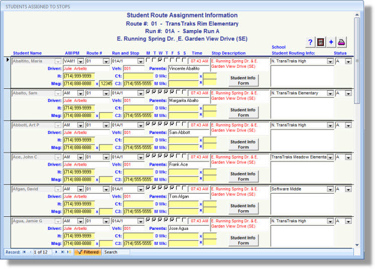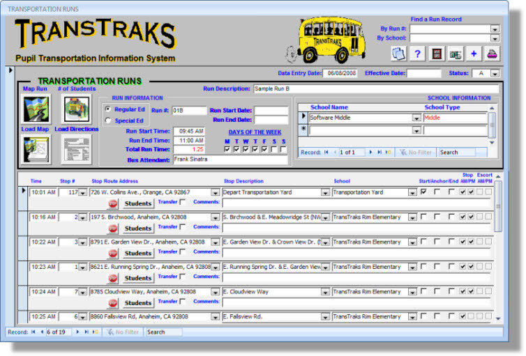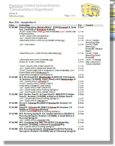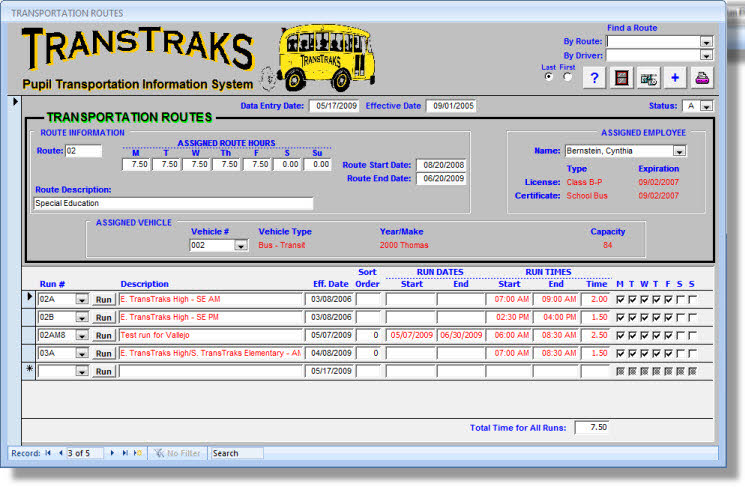 The Routing Module’s forms are powerful, yet easy to use. You can easily generate your route sheet directions for your driving staff. The assumption of the system is that one or more bus stops make up a run and one or more runs make up a route. You can cut many hours off of your run and route development times each year. You can even use TransTraks to map your school boundaries and walking distances and then perform what-if scenarios for changes to school boundaries and/or transportation walking distances.