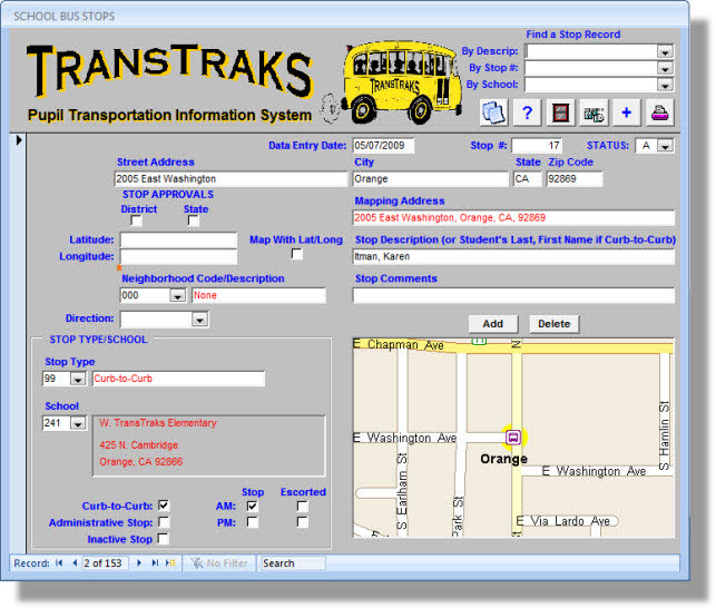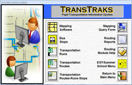 TransTraks builds your transportation system starting with your bus stops. The program is integrated with Microsoft’s MapPoint, resulting in a comprehensive, powerful, yet easy to use package that maps your stops, allows you to develop and optimize your runs and then combines them into routes. Microsoft generally updates in maps on a yearly basis, resulting in up-to-date streets and developments.