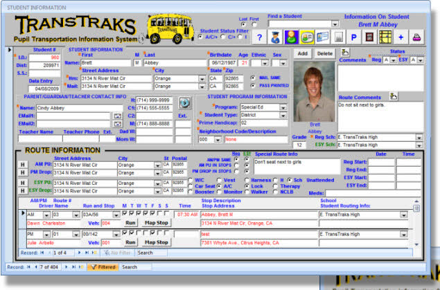 The Student Module of TransTraks provides you with an easy to use form that captures all your important student data. It can then support your student routing, student bus passes, etc.