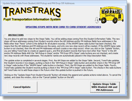 TransTraks provides you with the ability to take your curb-to-curb student addresses and automatically create stops in the Routing Module. Thousands of stops can be created with one click of a button.