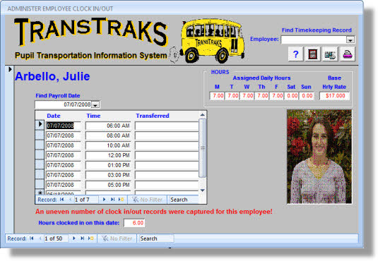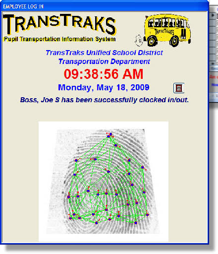 TransTraks has a bio-metric option that allows you to use our Timekeeping Module as a Time Clock and/or an Employee Messaging Center, reminding employees of field trips that day, printing out messages for them, etc.
