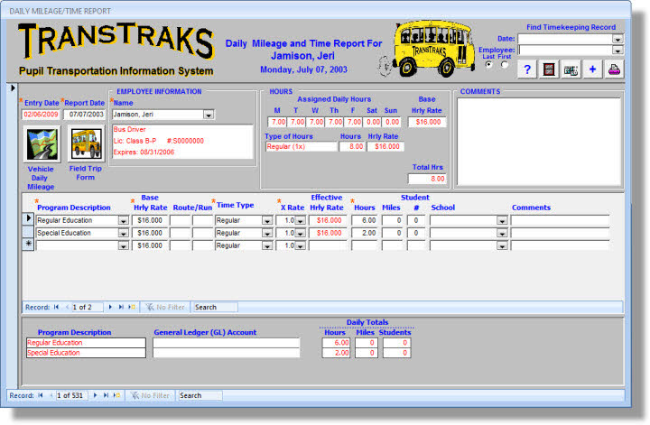 You can easily enter a time card for an employee into TransTraks. In addition, you can enter numerous individual lines of activities for the employee. For example, the employee’s day is divided between Regular Ed and Special Ed, or the driver did a field trip later in the day. You can also capture absences like sick leave, jury duty, etc. You can then print out a timesheet for your district’s pay period for the employee and submit to your payroll department.