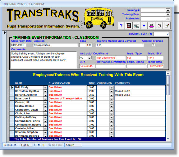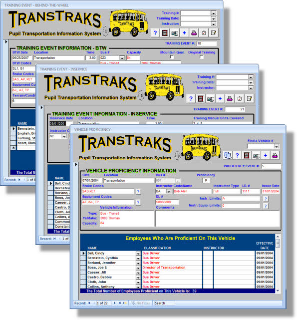 All the training forms have a similar look and feel. You enter a training event at the top of the form and then link the employees who attended in the bottom half of the form. Districts report saving hundreds of hours per year in the maintenance of training records. TransTraks keeps track of the various training events for each employee and provides comprehensive reports for training compliance reporting.