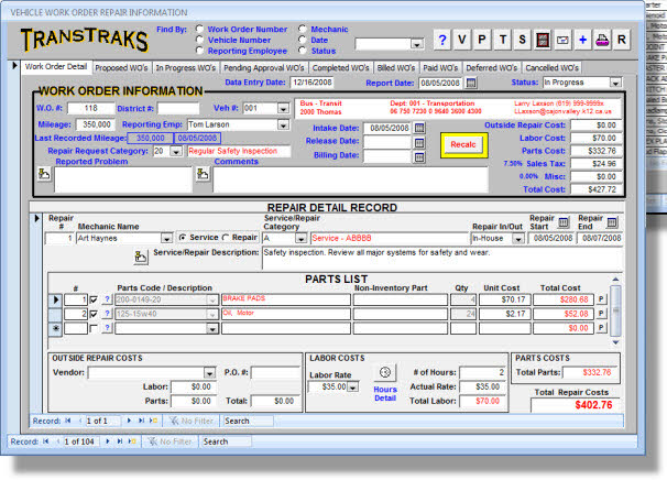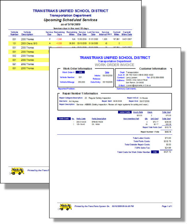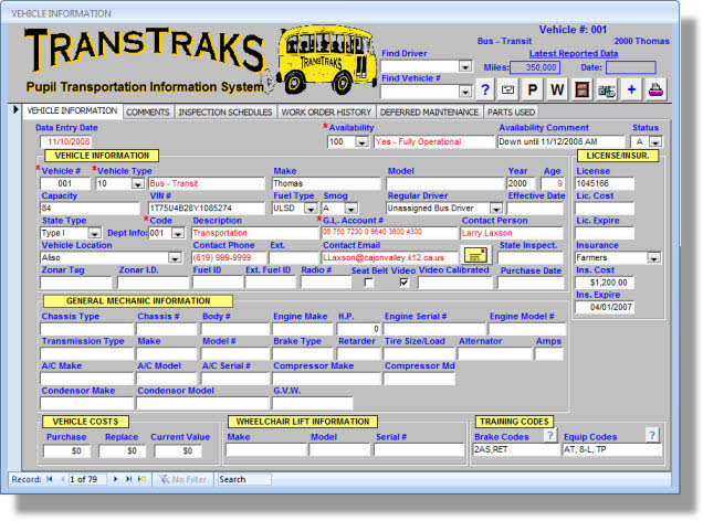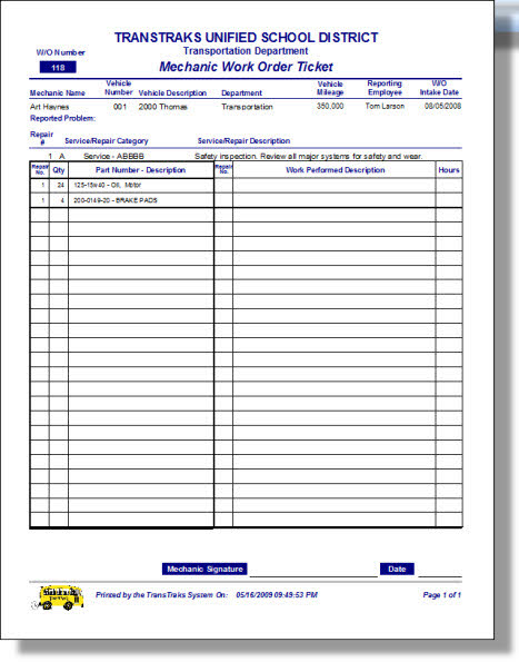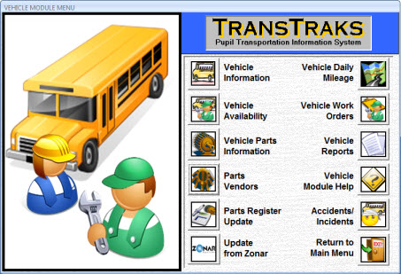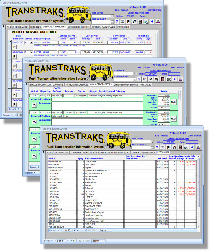 The Vehicle Module includes an easy to use and yet comprehensive vehicle maintenance system with parts inventory, and vehicle work orders. You can even order your replacement parts on-line through our Parts Vendors Form. The Vehicle Module also supports other modules of TransTraks, including Training and Activity/Athletic Trips. It also includes numerous comprehensive reports.